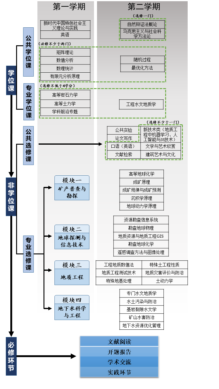 地质资源与地质工程学科硕士研究生专业课程的设置根据《冰球突破豪华版官方网站“能力导向的一体化教学体系建设指南”》制定,实施课程总量限制,总专业课程(包括专业学位课、专业选修课)不超过30门。专业课程的设置实行审查准入制,研究生专业课程要有相应的课程教学大纲、教材和教案。研究生课程中增加 “学科前沿专题”必修课程,该课程可由多位教授联合讲授。其他专业课程参照课程设置方案进行。