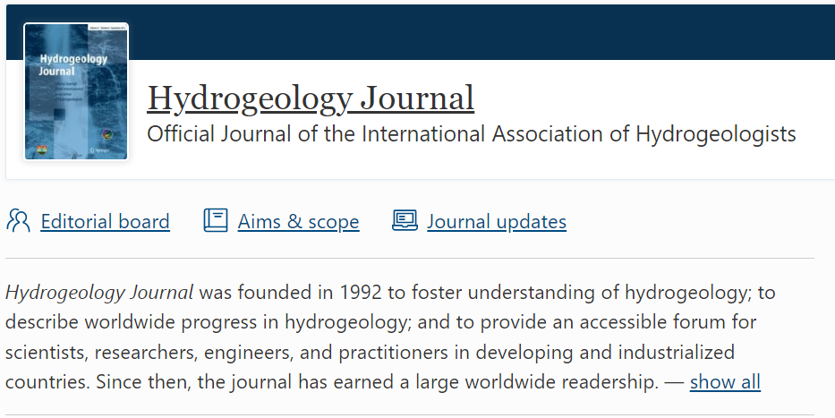 《Hydrogeology Journal》于1992年创刊,是国际水文地质学家协会(International Association of Hydrogeologists,IAH)官方期刊,水文地质领域的国际权威期刊,由德国斯普林格(Springer)出版社出版发行。目前,该期刊影响因子为3.151,在JCR的Water Resources和Geosciences领域的SCI源刊中均位于Q2区。