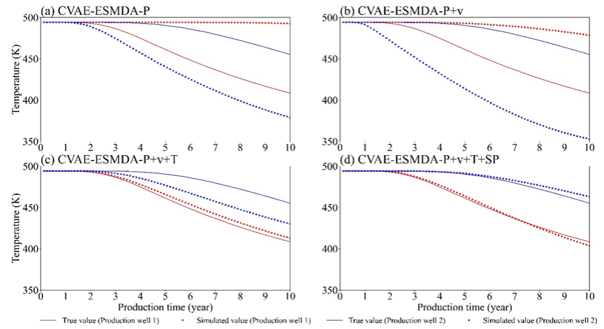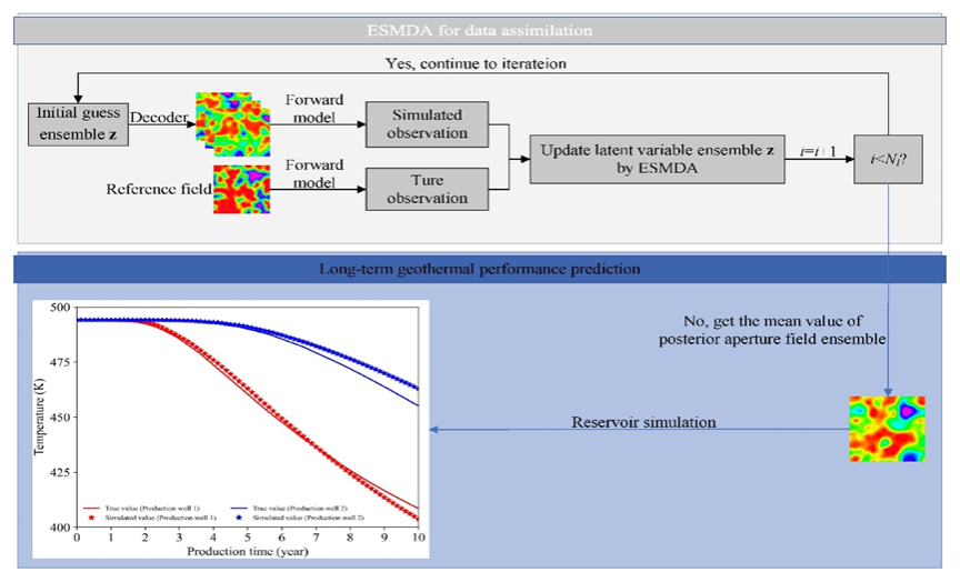 地热能作为一种无碳、可再生的能源,已被广泛应用于电力生产中。凭借干热岩分布广泛、储热含量高,增强型地热系统(Enhanced geothermal systems, EGS)逐渐成为一种热门的地热开采方式。单裂隙作为EGS中导水、传热的通道,对其进行精细刻画在能源开采规划、储层风险评估等方面都具有重要意义。钱家忠教授团队采用基于深度学习方法的联合反演框架(Convolutional variational autoencoder – ensemble smoother with multiple data assimilation, CVAE-ESMDA),融合多源观测数据(压力、流速、温度、自然电位),对非高斯单裂隙储层进行精细刻画并基于刻画结果对储层的产热性能进行预测。