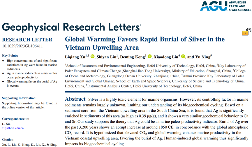 近日,地球科学领域知名学术期刊、自然指数刊物《Geophysical Research Letters》(地球物理研究快报)以“Global Warming Favors Rapid Burial of Silver in the Vietnam Upwelling Area”(全球变暖促进了越南沿岸上升流区银元素的快速埋藏)为题在线发表了冰球官网南海古海洋学的最新研究成果。