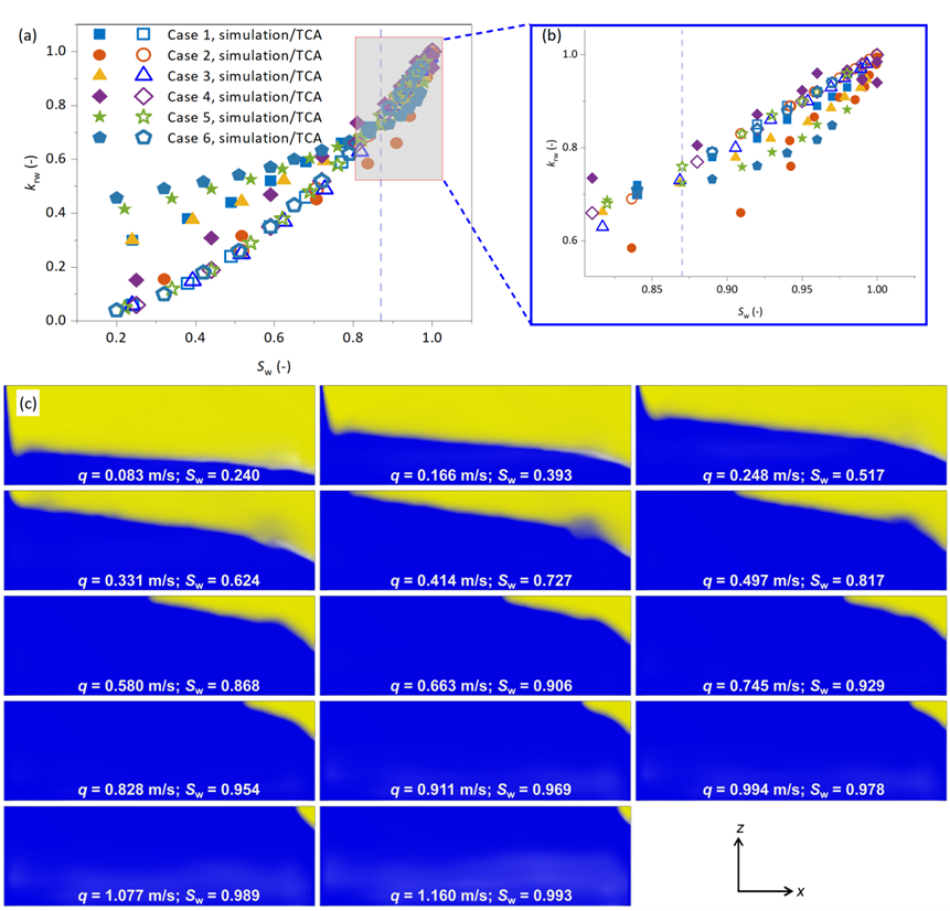 (a-b)数值实验与TCA方法估算相对渗透率的对比分析(c)在曲折垂直裂隙中,两相流动结构在垂直平面(xz)上的投影特征