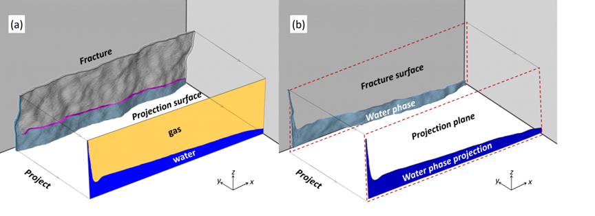 (a)TCA方法提出的通道曲折度计算和通道面积的示意图(b)裂隙表面的曲折度、水相界面的表面积及其投影面积