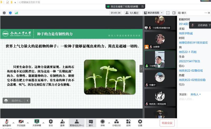 讲座中,丁宏霈老师以“种子的力量”为切入点,引导同学们对生命的韧性进行思考,并结合心理韧性的专业知识解读了何为生命、生命的意义是什么。接着,通过典型的案例分享讲解了生活中可能遇到的生命困惑,并从“认知、动机、主观体验”三个维度给出了拓宽生命宽度、找寻生命意义的方法策略。最后,借用电影里的经典片段帮助同学们理解生命价值的内涵,给出“发掘自身的创造性”“进行主动或被动的积极体验”“肯定苦难本身在人生中的意义”三种探寻生命意义的途径。同学们通过聊天框积极互动,彼此分享交流,活动气氛热烈。