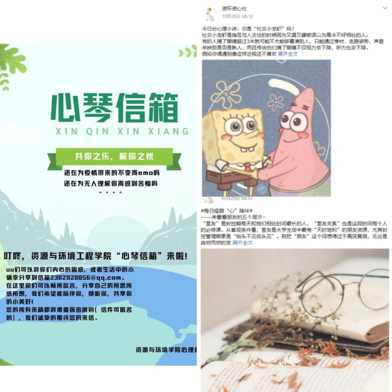 10月下旬,学院“心琴信箱”全面升级、全新上线,邮箱面向全院学生开放,通过资心社官方公众号进行宣传,旨在以笔尖心流的文字形式帮助同学们答疑解惑、给予心灵关爱。