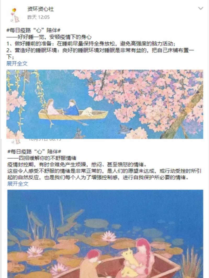 10月底至11月初,资心社利用官方宣传平台转载推送“每日疫路‘心’陪伴”等一系列疫情期间心理健康防护主题网络文化作品,帮助同学们掌握心理调适方法,积极应对生活。