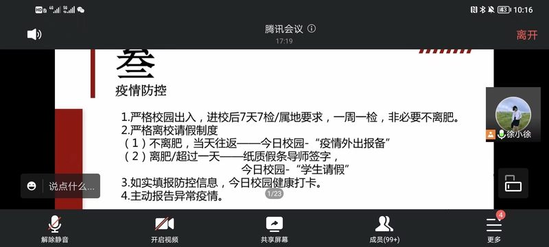 会议伊始,学院学科秘书张妍、研究生辅导员徐晨晨向新生研究生表达了热烈的欢迎,接着分别从研究生日常教育管理入手,就研究生在校期间的培养方案、课程规划、疫情防控、安全问题、奖助政策、党团班级建设以及近期的一系列工作安排进行讲解。在日常管理方面,提示疫情期间请销假、打卡制度,共筑安全校园;在奖助勤贷方面,详细介绍校院奖助政策;在学生培养方面,仔细解读培养方案,梳理选课注意事项。同学们认真聆听,做好新学期准备。