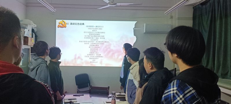 活动由党支部书记余文主持。她将清明节的起源、相关含义及相关习俗娓娓道来,带着同学们一起回顾历史、展望未来。在一首《我爱你中国》的小提琴背景音乐中,“诵读红色经典”环节开始。发展对象山谨铭领读诗词《清明情思—献给烈士》,所有同学自觉起立跟读。“没有人愿意在十八岁就永远睡去 唯独绿色的他们,为了保护身后那群白鸽子的梦…”一句句震撼人心的诗词让大家群情激奋,内心久久不能平静。