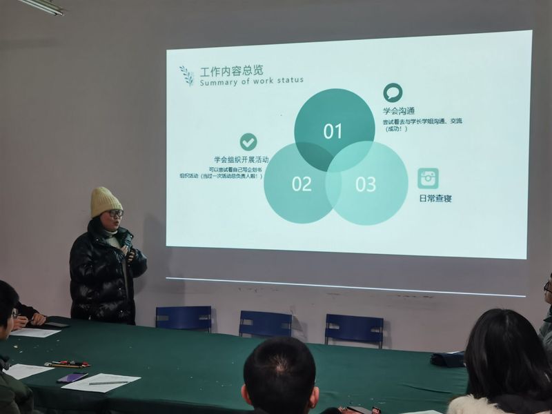 本次活动由学生会各部门负责人参与答辩,主席团成员冯晨同学、赵喜军同学进行提问。各部门按照抽签顺序逐一进行发言,对本学期部门工作进行总结反思,并对下一学期的学生工作做出展望与改进。
