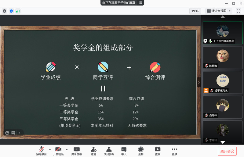 会议伊始,王老师针对奖学金问题,细致地讲解了评选细则,让许多同学们如拨云见日,更加明确了要在大学期间获得一次优秀学生奖学金的信心,坚定更加努力奋斗的决心。