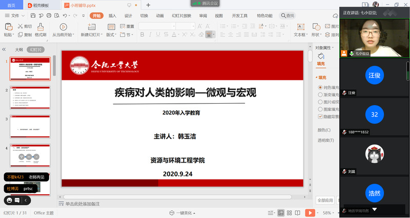2020年9月24日晚,冰球突破豪华版官方网站通过腾讯会议,开展“疾病对人类的影响——微观与宏观”主题入学教育,主讲人韩玉洁老师从生物学、社会学角度出发,为2020级新生讲解了疾病与人类的关系。