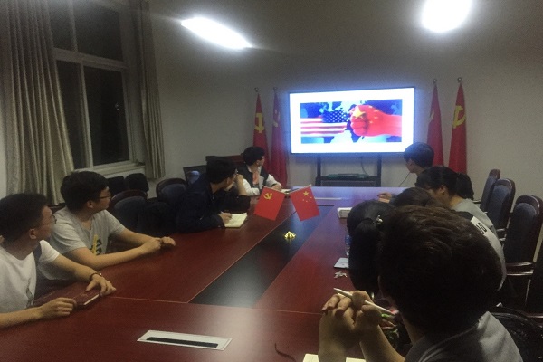 在党小组会进行时,在组长年潇同学的带领下大家一起先学习了有关两会的知识,认识了国家的改革进程,极大促进了各位党员对于时政的认识。随后,大家对于中美贸易战这一这点话题进行了讨论,从贸易战的起因,和贸易战对于双方的利弊和自己对于这一事件的认识都积极发表了自己见解。最后,参加小组会的各成员交换意见,本次党小组会圆满结束。