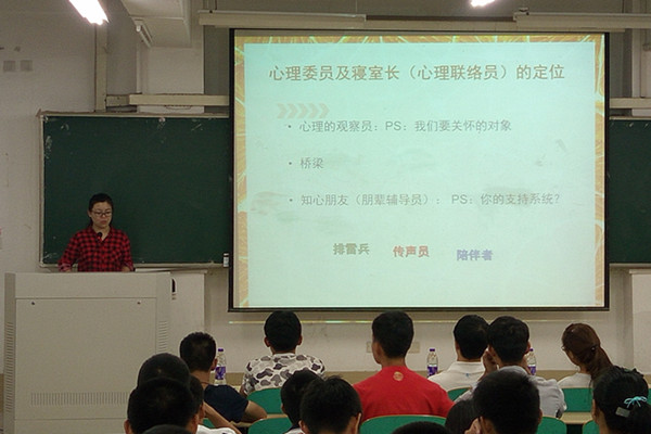培训会上,该院2016级辅导员范鹏飞介绍了此次培训的目的和意义,希望同学们多学习、主动学习,积极为他人服务,共同营造健康、愉快的班级及寝室氛围。学院心理负责老师王宏蕾通过具体案例分析,提出了“健康金三角”的概念,阐明了心理委员及寝室心理联络员的定位、职责,通过设置“人们对心理辅导的误解”的提问环节,引发同学们热烈讨论,最后得出做好心理委员及寝室心理联络员要遵从“尊重 真诚 共情 关注 关心 关爱”的十二字原则。