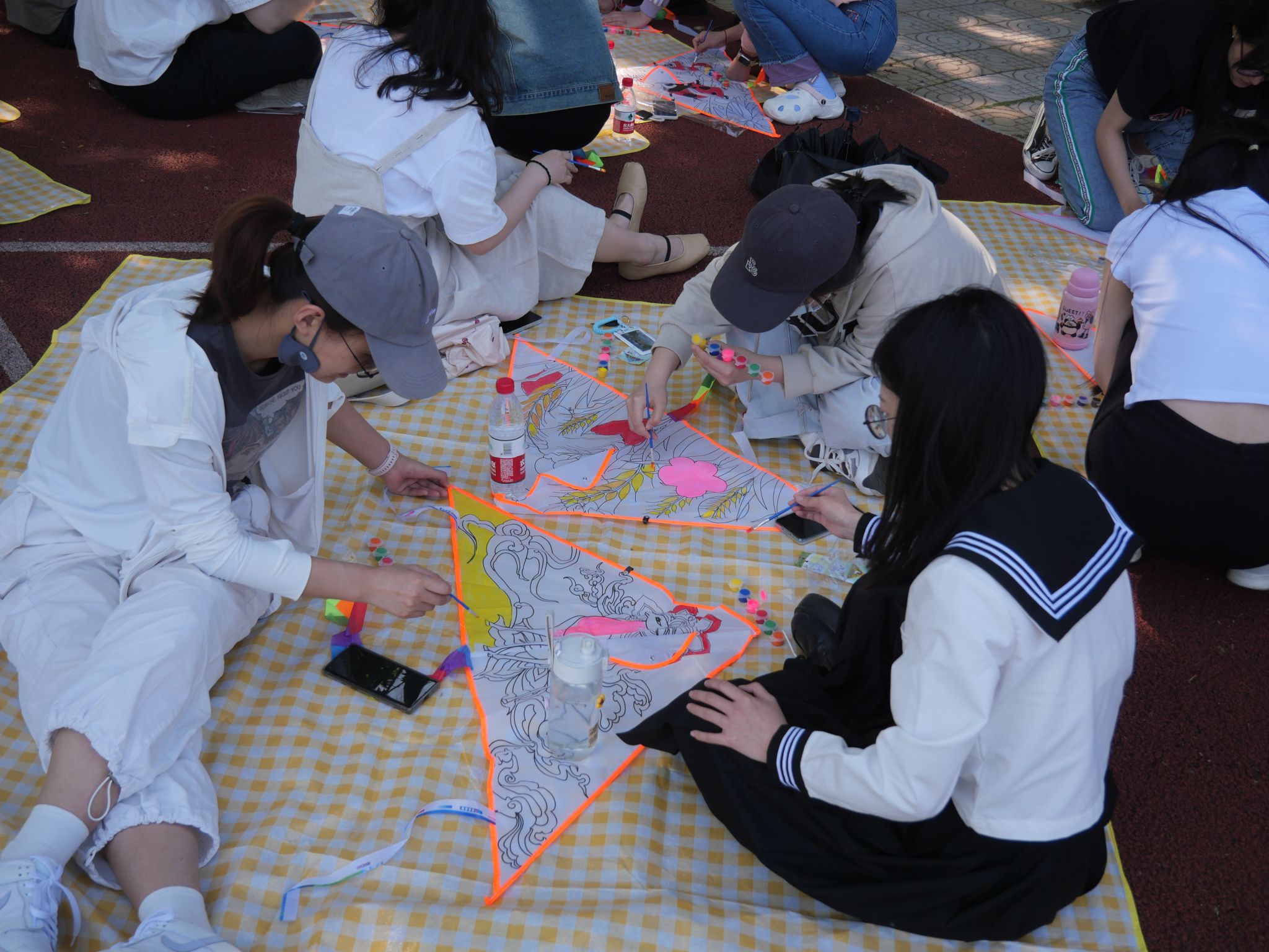活动现场,老师同学们按照预先的分组井然有序地进行签到并领取相关材料。大家围坐于操场树荫下,挥毫舞墨,在尚未着色的风筝上绘制心中的图案。有的展现自然美景,有的勾勒卡通形象,有的述说学习感悟。涂鸦的过程充满欢声笑语,师生相互交流、共同努力,五颜六色的风筝陆续出现在大家手中。涂鸦完成后,便是令人期待的风筝放飞环节。放眼望去,草坪上同学们在奋力奔跑,天空中各式各样的风筝在乘风翱翔,它们互比高低,都在向着蓝天,向着白云,向着未来展翅飞翔。