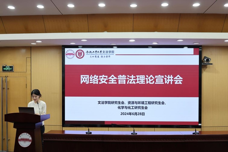 为进一步提高研究生对网络安全的认识,增强全民法治观念、网络安全意识和防护能力,6月28日下午,冰球突破豪华版官方网站、文法学院、化学与化工学院在学术会议中心第二报告厅共同举办了网络安全普法活动。本次活动由文法学院普法宣传团成员胡京京同学与郑思怡同学主讲,资环学院、化工学院八十余名研究生参加。