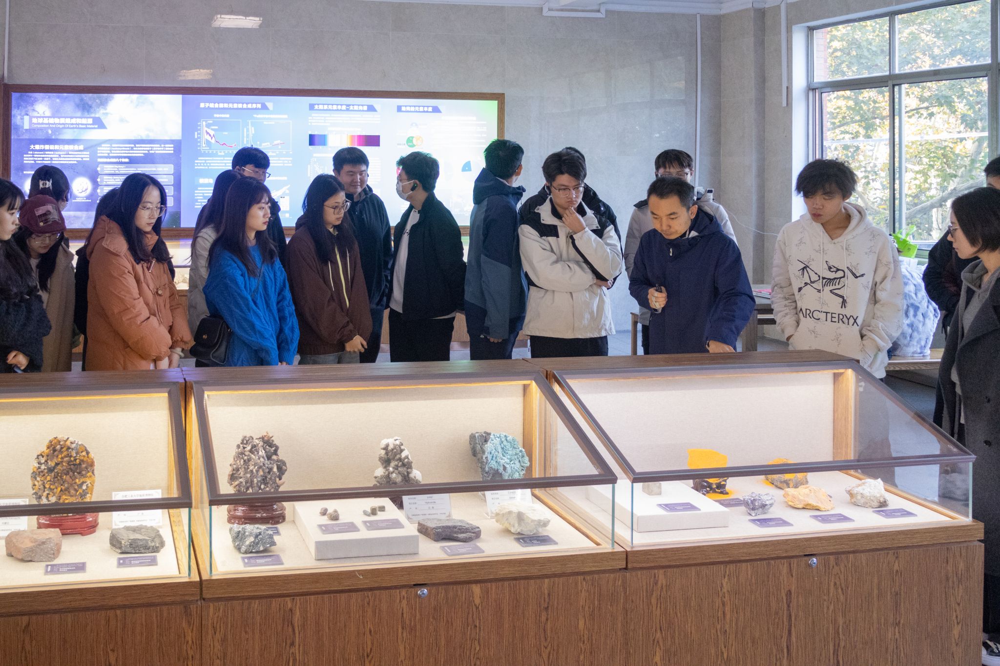 仰望星空,奇异陨石从遥远星空来访;俯瞰大地,璀璨矿石从地底深处出世。孙贺结合展厅内容,从最基本的元素出发,通过各类矿物、岩石和矿石的讲解,带领同学们身临其境地观察地球的物质组成,走进地球的物质世界。大家在浩瀚的地学发展历程中感受着磅礴的精神力量,一张张地质科学家打造的足迹地图赫然眼前。随后,师生围坐在一起,就地球的物质结构、新时代地学青年的使命担当等方面展开了热烈的分享交流。同学们纷纷表示,在实地参观和师生互动中,进一步感悟到地学先辈们热爱祖国、追求理想、执着科研的精神特质,未来将在薪火相传中汲取力量、砥砺奋进。