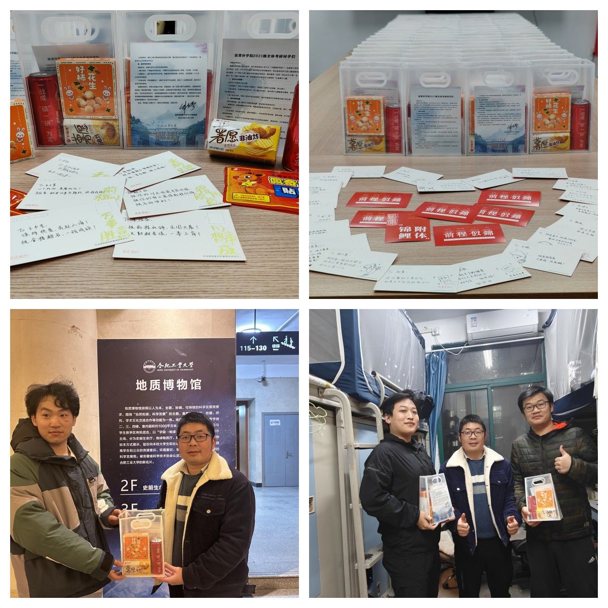 活动过程中,学院精心为全体考研学生筹备了考研加油包,内含“薯愿”、“好事花生”、暖宝贴以及“一战成硕”定制版可乐等富有良好寓意的小礼品。每一份加油包都凝聚着学院对考研学子关怀与期许,希望能够为他们的考研之路增添一份温暖和力量。同时,学院特别组织了学生志愿者团队,亲手撰写考研祝福明信片。明信片上寄托了来自同学的鼓励与祝福,激励考研同学们以更加积极的心态面对考研的挑战。每一张明信片都承载着满满的正能量,期待为考研学子带去心灵的慰藉与动力的源泉。