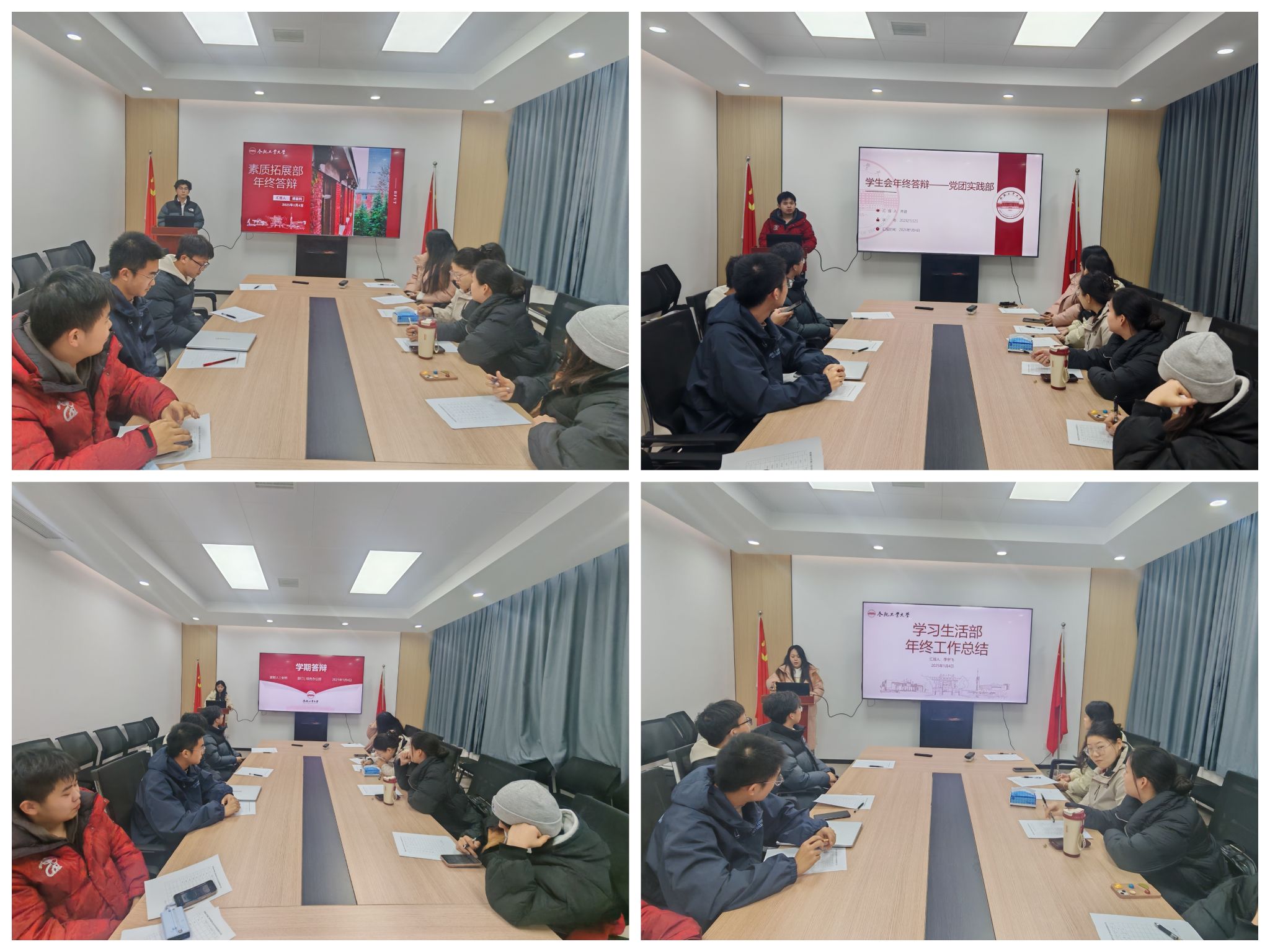会上,各部门负责人汇报了本学期的工作成效,也指出了下一步工作计划。素质拓展部胡能科、舒琦、南志鹏就校运会组织、129汇演策划等做了总结,也反思了工作中存在的不足;党团实践部齐进就团组织转接、团费收缴、主题团日开展、特色团日策划等进行了梳理;综合办公部安然、杨晓莉展示了部门在秋季校运会、资环小锤锤运营、元旦晚会等活动中的风采,表示未来将在活动策划、内容形式、沟通效率等方面持续优化。学习生活部李宇飞、默子凯则对部门在学风建设、早锻炼检查、寝室文化活动策划方面的情况及成果进行了回顾。