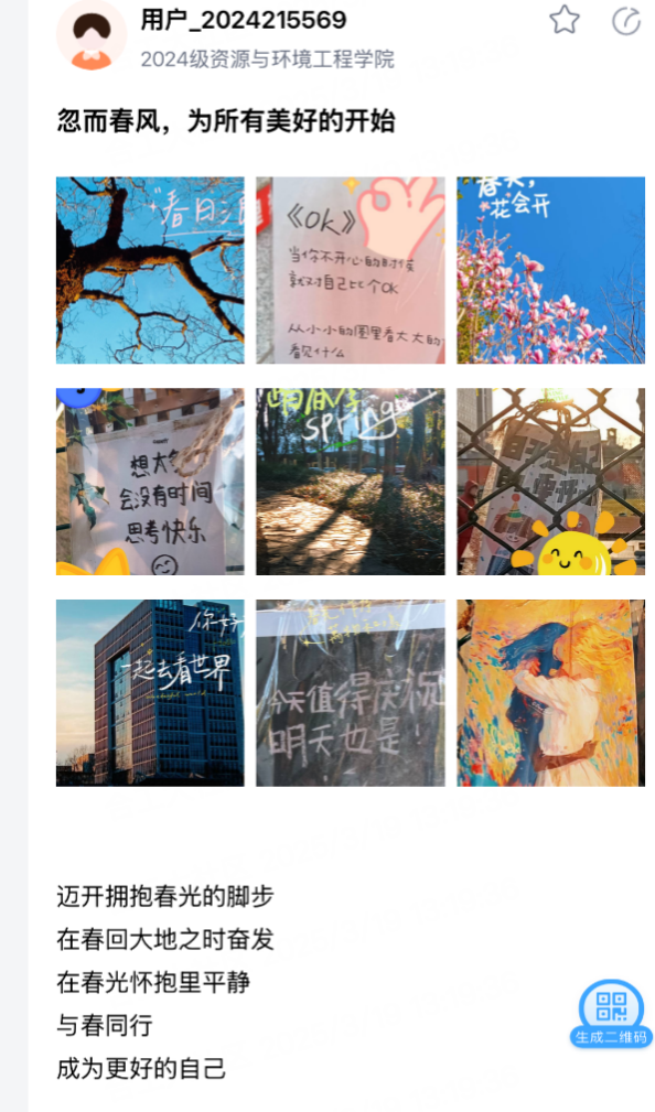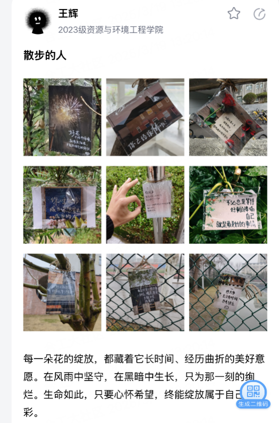 本次活动注重贴近学生生活日常,将心理健康教育融入校园生活场景,是学院心理育人品牌建设的创新实践。参与者表示,在寻找图片的过程中重新发现了熟悉角落的细节之美,如操场围栏旁的蔷薇花丛、食堂外墙的爬山虎新芽等。通过拍照记录与文字分享,学生们以独特视角展现了对校园生态的观察与对生命成长的思考。
