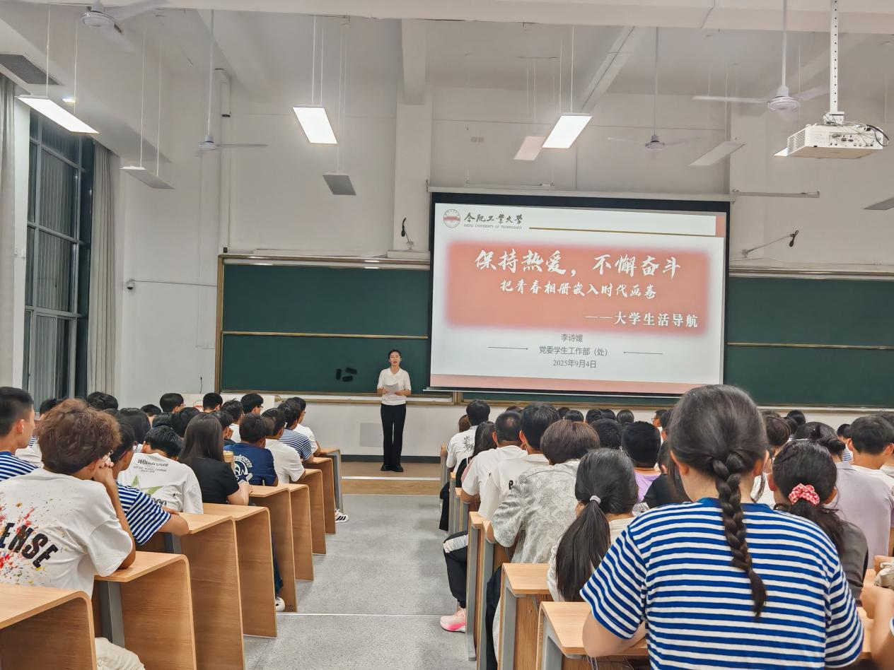 李诗媛以“识地域·融大学·会学习·睦人际·谋成长”为主线展开讲解。她从安徽历史文化底蕴切入,帮助新生理解地域发展与个人成长的关联;随后,李诗媛详细介绍了工大的校园生活指南,重点强调了大学在学习习惯、课程设计、考核标准等方面与高中的区别,引导同学们总结科学高效的学习方法,尽快完成大学身份转换。最后,李诗媛从人际交往、心理调适、职业规划、综合发展等多维度,引导新生建立阶段性目标,在专业认知和社会适应中夯实发展路径。