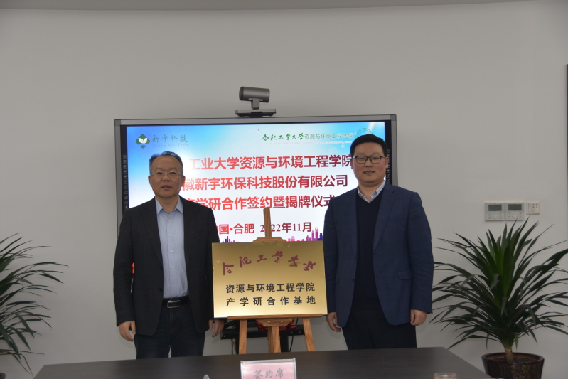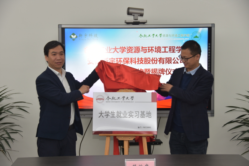 资环学院院长袁峰、党委书记南国君分别与新宇环保董事长兼总经理张友德代表校企双方签署《产学研合作基地协议书》《冰球突破豪华版官方网站大学生就业实习基地协议书》。并分别为“冰球突破豪华版官方网站产学研合作基地”“冰球突破豪华版官方网站大学生就业实习基地”揭牌。