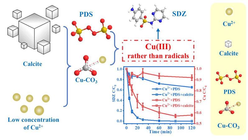 方解石是土壤环境中最常见的碳酸盐矿物,被认为是处理金属污染的有效稳定剂。Cu(II)活化氧化剂降解有机污染物能力有限,而固相铜(包括铜的氧化物和络合物等)能有效活化氧化剂处理有机污染物。综合两者优势,团队首次利用方解石将溶液中Cu(II)转化成固相铜活化过硫酸盐,实现抗生素有机污染物的高效处理。成果于2022年7月以题为“The synergistic effect of calcite and Cu2+ on the degradation of sulfadiazine via PDS activation: A role of Cu(Ⅲ)”发表在《Water Research》期刊上(图2)。冰球官网博士研究生孙付炜为论文第一作者,刘海波副教授为论文通讯作者,冰球突破豪华版官方网站为论文第一单位。