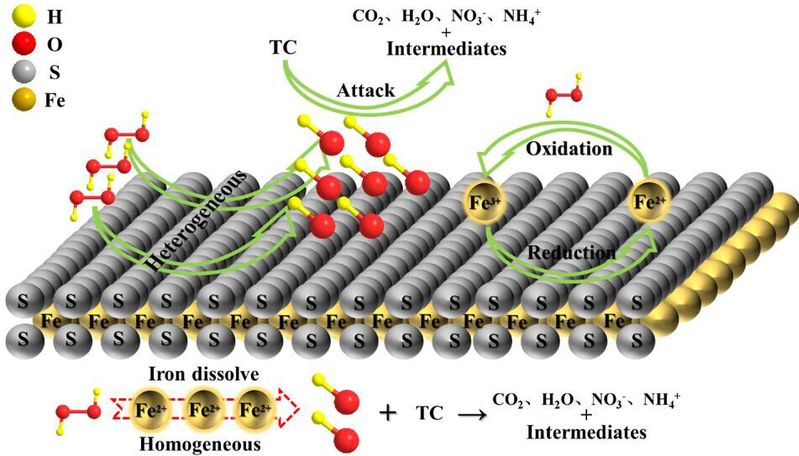 随着全球抗生素消费量迅速增长,大量未被利用的抗生素通过城市污水处理厂、雨水淋滤或堆肥处理等途径进入地表水、地下水及土壤,对人类健康和生态平衡构成巨大威胁。因成本低廉,操作简单等特点,以零价铁、氧化铁和负载型铁基为催化剂的非均相芬顿催化技术被广泛应用于抗生素处理,但仍存在催化剂电子选择性差、易产生铁泥、回收再利用困难等问题,直接增加有机废水处理成本。为解决上述问题,团队以天然纳米矿物—鲕状赤铁矿为前驱体,通过高温硫化方法,制备了具有多孔结构、高化学反应活性和可回收利用的磁性非均相催化剂,实现水体中四环素快速降解和矿化。成果于2020年1月以题为“Sulfurized oolitic hematite as a heterogeneous Fenton-like catalyst for tetracycline antibiotic degradation”发表在《Applied Catalysis B:environmental》期刊上(图4)。冰球官网博士研究生王汉林为论文第一作者,刘海波副教授为论文通讯作者,冰球突破豪华版官方网站为论文第一单位。