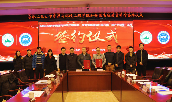 1月28日,冰球突破豪华版官方网站与安徽省地质资料馆共建“政产学研用”基地签约揭牌仪式在省地质资料馆学术报告厅顺利举行。安徽省自然资源厅矿保处调研员朱宗银、安徽省地质资料馆馆长尹峰及资料馆相关部门负责人,冰球突破豪华版官方网站院长袁峰、院学术委员会主任周涛发、副院长崔康平、院党委副书记兼纪委书记鲍丽娟及学院相关代表老师参加签约揭牌仪式,仪式由安徽省自然资源厅矿保处主任科员杨靖韬主持。