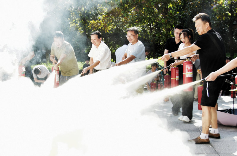 培训结束后,师生来到附近的演习场地,在消防科老师的指导下个个亲手操作,学会使用灭火器。当演习桶里的火苗刚一窜起,师生们便手持灭火器在距离3-5米处,对准火焰根部“扫射”,瞬间就扑灭了火焰,将之扼杀于萌芽状态。