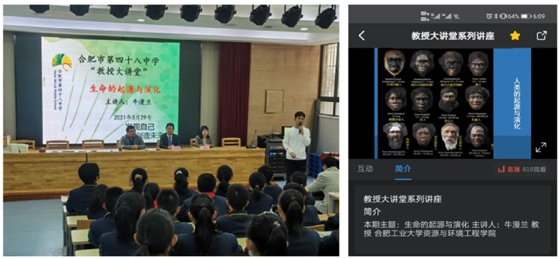 2021年3月29日下午,我院牛漫兰教授再次受到合肥市第四十八中学的邀请做客“教授大讲堂”。本次,牛漫兰教授带领沈岳峰老师和孙毅博士以“生命的起源与演化”为题为四十八中的同学们做了一场别开生面、深入浅出的学术报告。这次报告除了以线下的形式进行,还创新采用在线公开课等形式线上直播,观看人次达800余人。