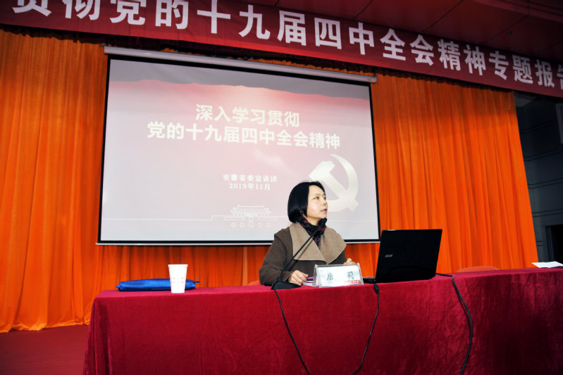动员部署会上,邀请了冰球官网马克思主义学院教授、安徽省委宣讲团成员唐莉为我院师生做了学习宣传党的十九届四中全会精神辅导报告。唐莉教授从党的十九届四中全会召开情况、会议主题、会议做出的《坚持和完善中国特色社会主义制度、推进国家治理体系和治理能力现代化若干重大问题的决定》的意义、决定的内容进行了全面认真的讲解。辅导报告内容丰富、条理清晰,为提高广大师生对全会精神的理解具有很强的针对性和指导性。
