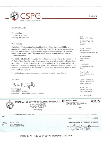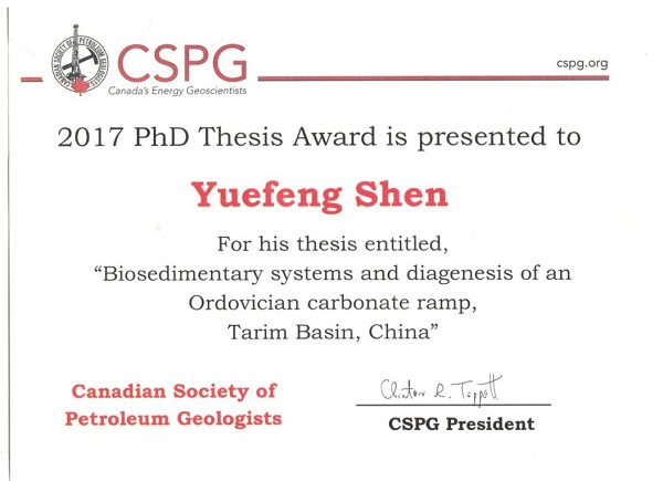 近日,加拿大石油地质学家协会(Canadian Society of Petroleum Geologists,CSPG)2017年度最佳博士论文奖评选揭晓。经过资格审核、通讯评议和专家评审,冰球官网冰球突破豪华版官方网站古生物学青年研究团队沈越峰博士的学位论文《Biosedimengtary Systems and Diagenesis of An Ordovician Carbonate Ramp, Tarim Basin, China》(塔里木盆地奥陶系碳酸盐岩缓坡生物沉积系统和成岩作用研究)获得本年度唯一最佳博士论文奖,并获得该协会授予的5000加元奖金。此次获奖是加拿大石油地质学家协会自1958年设立该奖项的60多年来第一次授予华人博士研究生。加拿大石油地质学家协会刊物《Reservoir》(2018年第二期)对此进行了专题报道。