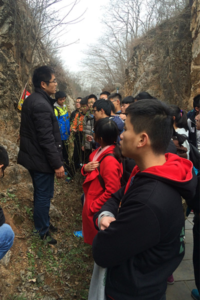 在淮南市舜耕山,学生们在老师的带领下不断地向着大山更深处与更高处行进,在攀爬过程中不断观察道路两旁出现的多种多样的岩石与植物,尝试着运用罗盘进行简单的测量和用地质锤分解岩石。参观过程中,老师还向学生们讲解了寒武纪、奥陶纪等时期的地质现象,并针对学生提出的疑问现场进行示范解读。