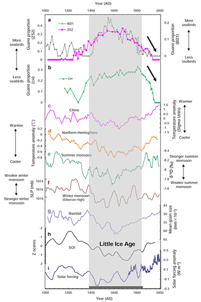 全球气候环境变化是目前广为关注的一个话题,自然生态系统是否能够承受如此快速的变化是十分关键的科学问题。西沙群岛曾是我国著名的鸟岛,但野外考察发现,海鸟目前在绝大多数岛屿上已近乎绝迹。探讨海鸟数量变化的原因、识别气候变化的影响,对于南海岛屿的开发保护具有借鉴意义。在中国人民解放军海军西沙水警区、三沙市人民政府和中共三沙市七连屿工委的共同协助下,研究人员对西沙群岛进行了详细的野外地质考察(图1),并在西沙琛航岛、赵述岛和北岛采集了保存完好的海鸟生物遗迹,综合运用地质年代学、生态学和第四纪地质学的研究方法,重建了晚全新世(近千年)以来的海鸟数量记录。结果表明,在气候相对凉爽的小冰期(公元1400-1850年),海鸟种群数量相对较多,而近150年来海鸟生态快速衰退(图2),这很可能与栖息地破坏、过度捕捞以及海洋环境污染等人类活动有关。该研究对认识和改善南海诸岛环境质量、维护生态安全提供了理论基础,对于理解全球变化背景下岛屿生态系统的脆弱性也具有十分重要的意义,在一定程度上推动了南海岛屿生态地质学的发展。
