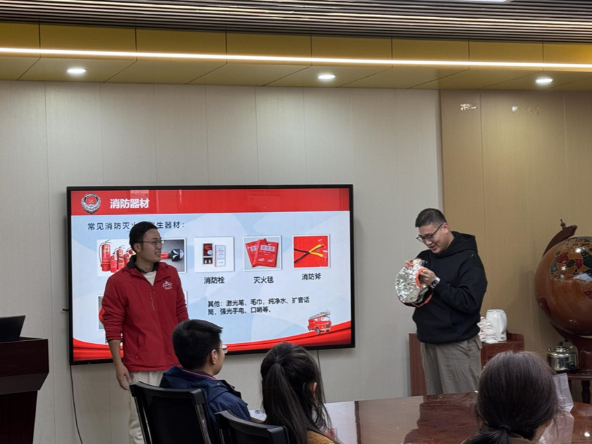 活动伊始,在纬地楼三楼会议室,由双安公司韦勇作消防知识宣讲与消防器材使用演示。随后,师生来到二楼大厅模拟室进行逃生疏散演习,最后在纬地楼主附楼之间空地进行灭火实操。通过演练活动,进一步提高了师生对突发风险源的警惕性,增强了应急意识,从而主动学习和掌握应急知识,并能验证应急预案的可操作性,提升应对突发情况的能力。