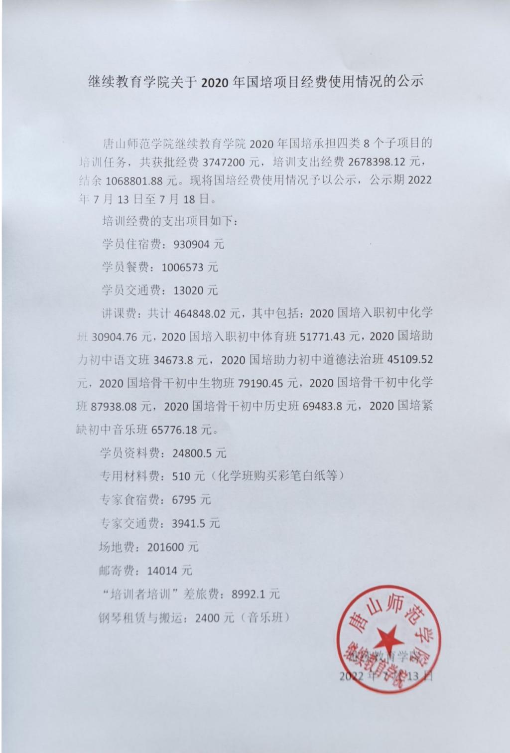 beat365在线唯一官网关于2020年国培项目经费使用情况的公示